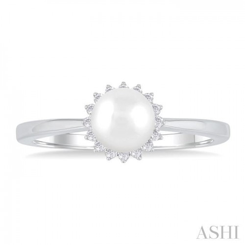 Perfect for any occasion, this petite pearl and diamond fashion ring adds a touch of elegance and grace to your look. Whether it is for a special event or to add a hint of luxury to your everyday wear, this ring is a fine addition to your jewelry collection. It features a glossy 6 MM round cultured pearl at its center, surrounded by a halo of 17 prong set round cut diamonds. The sparkling diamonds create a captivating floral design, perfectly highlighting the pearl’s natural beauty. A plain gold reverse tapered shank offers a subtle yet elegant contrast to the intricate centerpiece. The fashion ring is styled in a rhodium finish 10 karat white gold. The total diamond weight is 1/10 Ctw.