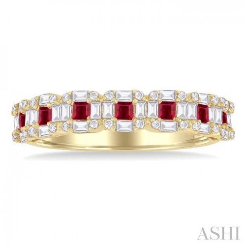 A masterpiece of craftsmanship and elegance, this precious ring offers a gorgeous blend of vibrant Rubies and dazzling diamonds, ideal for those who appreciate fine jewelry. Lining the center of the ring top, is a row of 7 prong set 2.00 MM princess cut Rubies, with 2 each, total 12, channel set baguette cut diamonds between them, and one each, total 2, at either end, adding a layer of brilliance and luxury to the central gemstone row. Also, beautifying the rims are 7 each channel set baguette cut diamonds, separated by 2 each prong set round cut diamonds between them, and one each at either end, making a total of 28 baguette and 28 round cut diamonds along both borders. The precious ring is styled in 14 karat yellow gold. The total diamond weight is 1/2 Ctw.