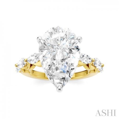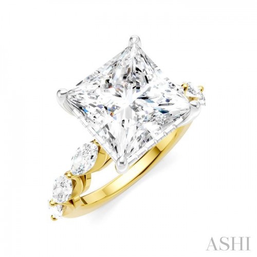 Begin a new chapter of your love with this exquisite semi-mount diamond engagement ring that offers a captivating blend of beauty and sophistication. It also gives you the freedom to choose a desired center stone, letting you the opportunity to create a ring that is as unique as your love, and ensuring that every glance at the hand serves as a reminder of the special bond you share. The ring features a 14 karat white gold prong-raised princess-shaped center mount, where a princess cut diamond ranging between 4.50 Ctw to 5.50 Ctw of your choice gets installed. Beautifying the shank are pre-decorated, 3 each fancy prong set marquise cut diamonds on either side, total 6 diamonds. 16 microscopic split prong set round cut diamonds embellish the gallery region. The semi-mount engagement ring is crafted in a rhodium finish 14 karat yellow and white gold. The total diamond weight is 1.00 Ctw.