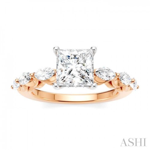 Begin a new chapter of your love with this exquisite semi-mount diamond engagement ring that offers a captivating blend of beauty and sophistication. It also gives you the freedom to choose a desired center stone, letting you the opportunity to create a ring that is as unique as your love, and ensuring that every glance at the hand serves as a reminder of the special bond you share. The ring features a 14 karat white gold prong-raised princess-shaped center mount, where a princess cut diamond ranging between 0.85 Ctw to 1.20 Ctw of your choice gets installed. Beautifying the shank are pre-decorated, 3 each fancy prong set marquise cut diamonds on either side, total 6 diamonds. 12 microscopic split prong set round cut diamonds embellish the gallery region. The semi-mount engagement ring is crafted in a rhodium finish 14 karat rose and white gold. The total diamond weight is 3/4 Ctw.