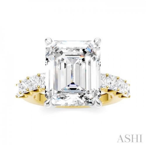 Make your love story unforgettable with this exquisite and meaningful semi-mount diamond engagement ring, which is more than just a piece of jewelry-it is a symbol of your love. At its heart lies a prong-raised princess-shaped center mount, where a center stone of your choice, a princess cut diamond ranging between 3.65 Ctw to 4.50 Ctw is installed. The beauty does not stop here, as the shank comes pre-embellished with 4 each fancy prong set 1/6 Ctw princess cut diamonds on either side. As you admire the ring from every angle, you will notice 16 sparkling microscopic split prong set round cut diamonds adorning the gallery region. The semi-mount engagement ring is molded in a rhodium finish 14 karat yellow and white gold. The total diamond weight is 1 1/3 Ctw.