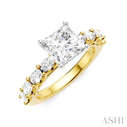 A reflection of your unique love story, this semi-mount diamond engagement ring has been meticulously crafted to capture its essence. It features at its core, a prong-raised princess-shaped center mount that eagerly awaits a perfect princess cut diamond, ranging between 0.85 Ctw to 1.20 Ctw of your choice. But the beauty doesn’t end here. The shank comes pre-adorned with 4 each fancy prong set 1/10 Ctw oval cut diamonds on either side, adding a touch of sophistication and balance to the design. As you gaze upon the ring, you will notice the delicate brilliance of the 12 microscopic split prong set round cut diamonds embellishing the gallery region. The semi-mount engagement ring is crafted in a rhodium finish 14 karat yellow and white gold. The total diamond weight is 7/8 Ctw.