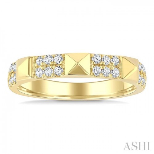 Bold geometry meets radiant sparkle in this diamond fashion ring, perfect for someone who appreciates design that dares to stand apart. Three pyramid-shaped accents rise from the band like sculptural peaks, creating a striking architectural rhythm across the ring top. Nestled between each pyramid are twin rows of shimmering fishtail set round cut diamonds, bringing brilliance and contrast to the sleek angles. There are 6 each between the three pyramids and 6 each following the end pyramids on both sides, completing the symmetrical design with a total of 24 round cut diamonds. Sculpted in 10 karat yellow gold, the fashion ring fuses edge and elegance. Total diamond weight is 1/4 Ctw.