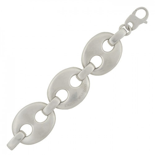 A bold and rare vintage Emporio Armani runway anchor link bracelet! This fashionable bracelet is made of sterling silver and is comprised of 3 very oversized anchor links. A sterling loop connector attaches each link together, allowing the bracelet to wrap comfortably around the wrist and the outside of the center link has the “EMPORIO ARMANI” logo etched on the front. It fastens with a simple lobster clasp. A very wearable everyday statement piece, it would look fabulous layered with other link bracelets and is perfect for the fashion-forward woman’s collection!