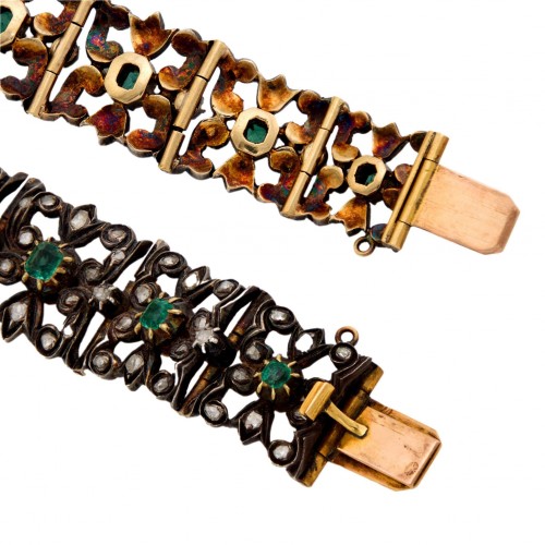 Condition:The overall condition of the bracelet is excellent. Besides normal surface wear, there is no apparent damage to the gold or silver setting. All of the emeralds and diamonds are secure and intact, and the push clasp is in working order.