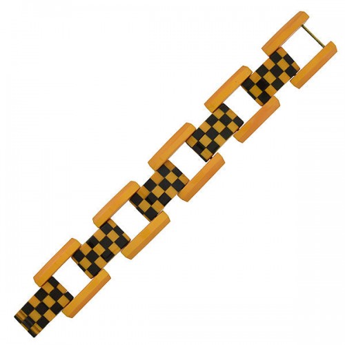 An unusual Bakelite bracelet from the Retro (ca1940s) era! This striking piece is comprised of carved Bakelite panels, which have been stacked and hinged to form a unique “gate link” bracelet. The Bakelite features a stylish checkerboard motif, with solid yellow and black colors that are opaque in appearance. At the back of the bracelet is a simple hook clasp disguised within the design, allowing the piece to open easily and close securely. A fun and funky vintage piece, this fashionable bracelet is perfect for the Bakelite collector!