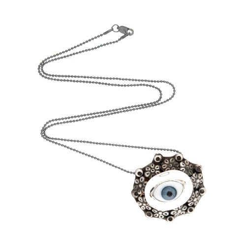 Retro Mexican Sterling Silver and Porcelain Evil Eye Pendant Necklace