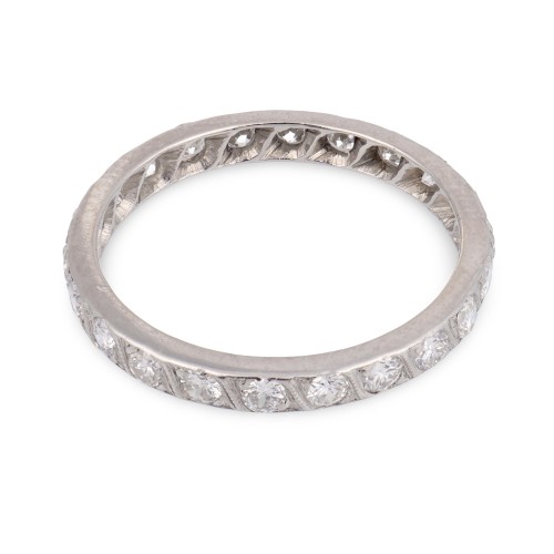 A sparkling eternity band from the Retro (ca1940s) era ! Crafted in platinum, this ring features a continuous row of channel-set single cut diamonds. Overall, the diamonds have an approximate total carat weight of 1.15ctw, and display H/I color and VS1-VS2 clarity. The band is also adorned with dainty engravings and milgrain-detailing, which adds a feminine look to the band. The top and bottom edges of the ring are smooth and simple.
