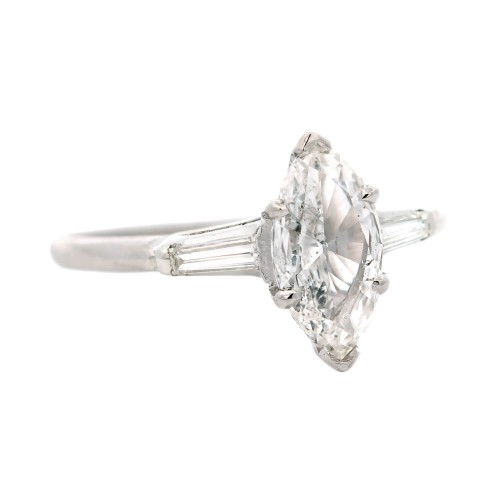 A simply outstanding diamond engagement ring from the retro (ca1940) era! This beautiful ring is made of platinum and holds a gorgeous Marquise Brilliant Cut diamond at the center. The diamond, which is prong set, has F/G color and SI2 clarity and weighs approximately 1.00ct. Resting at the shoulders of the ring are two sparkling tapered baguette cut diamonds in a bezel setting, which have G-H range color, VS2 clarity and a total weight of approximately 0.22ctw. Stamped inside the ring is “10% IRID. PLAT”. The ring is accompanied by a recent appraisal dated February 2023 by an accredited GIA Diamonds Specialist. A stunning retro diamond ring fit for any engagement!