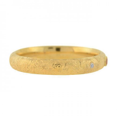 This stunning bangle bracelet from the Art Nouveau era (ca1900) is a wonderful example of the Riker Brothers‘ talent! Crafted in vibrant 14kt yellow gold, the bracelet is a slip-on style bangle, and features 3 sparkling gemstones. Known for their attention to detail, this gold piece is decorated in a lovely floral and scrolling etched design, which covers the entire outer surface. A large synthetic ruby stone is set at the center of the bracelet, bezel set and vibrant in color, while two sparkling diamonds are set on either side. The old Mine Cut diamonds are bezel set in white gold and act as the centers of two wonderfully etched flowers. The ruby weighs approximately 0.90ct and collectively, the two diamonds have a total overall weight of 0.20ctw. Stamped along the inside of the bangle is the Riker Brothers sword maker’s mark along with “14K.” The bangle’s design is very versatile, and would look wonderful worn alone or stacked with other complimentary bracelets. A wonderful Art Nouveau piece by a legendary maker, it would compliment any collection!