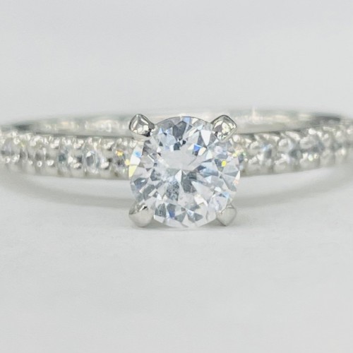 A stunning detailed twist setting. Made out of white gold this ring features a detailed twist shank with beautiful etching on the sides. Accented by round brilliant diamonds all over and millgrain to give it that extra pop.