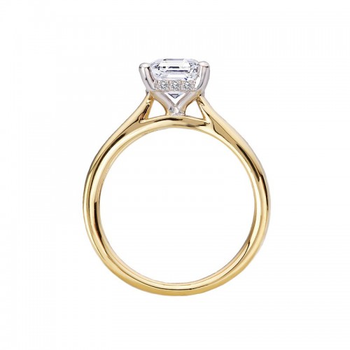 A bold 14K yellow gold engagement ring with a hidden halo of diamonds beneath a striking emerald-cut center. Crafted to cradle an 8.5 x 6.5mm emerald-cut diamond, this semi-mount design features 0.07ct of conflict-free diamonds.