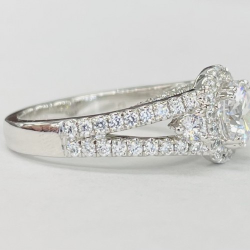 A breathtaking three stone setting with a plethra of diamonds. Made with a halo for your center stone and two larger diamonds on the side. Accented by round brilliant diamonds all over, a split shank to add contrast, and a undercarriage of diamonds.