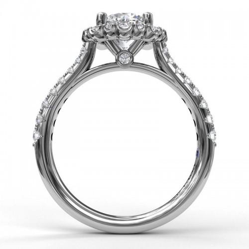 The beauty of this piece is found in its dainty scalloping halo, which makes this ring stand out with a fresh, lively feel. This delicate halo with pave band engagement ring can be special ordered in any finger size, in Platinum, 18KT & 14KT gold and can be customized for any shape and size centerstone.