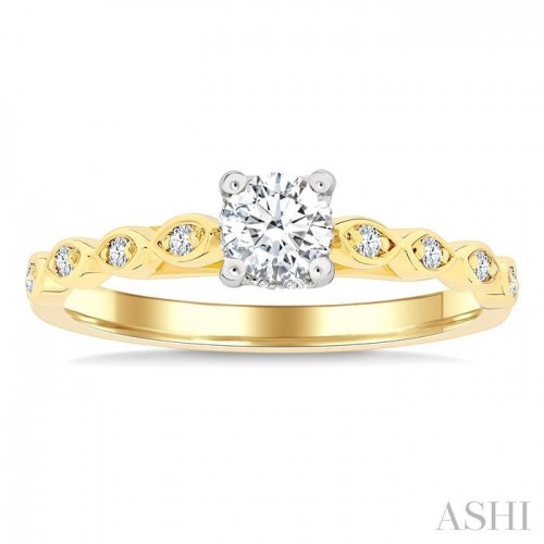 This diamond engagement ring blends timeless beauty with intricate design. It centers on a 1/3 Ct round cut diamond held in a large white gold prong setting. The cathedral shank displays four marquise-shaped carved mounts linking on either side, each mount adorned with a pave hand set round cut diamond, total 8. The gallery is enhanced with 8 micro wall set round cut diamonds, 2 on each side, adding subtle brilliance from beneath the center stone. Crafted in polished rhodium finish 14 karat yellow and white gold, the two-tone styling creates a striking contrast while amplifying the ring’s luminous appeal. Perfectly balancing classic and artistic detail, the design offers a distinctive yet elegant choice for an engagement ring. Total diamond weight is 1/2 Ctw.