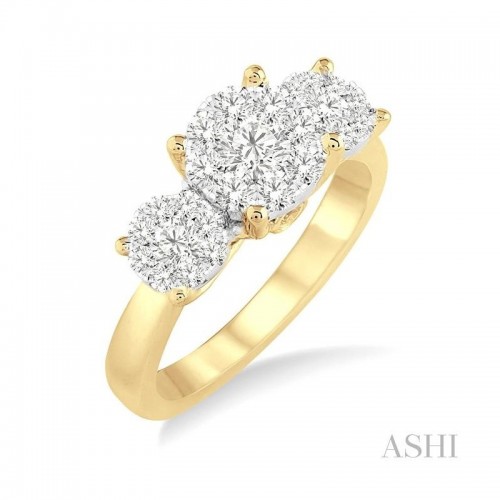 A lustrous diamond engagement ring, this offers visual and aesthetic appeal. Although the engagement ring features a simple design, it looks impressive, with its attractive triple mount centerpiece. The center mount is raised higher than the mounts flanking it, but these too are raised above the shank. A prong set 1/2 ct round cut center stone accentuates the center mount, while a prong set pear cut diamond each embellishes the flanking lower mounts. Also seen is 4 each micro wall set round cut diamonds lining the shank on either side. The diamond engagement ring is styled in 14 karat white gold. Total diamond weight is 7/8 ctw.
