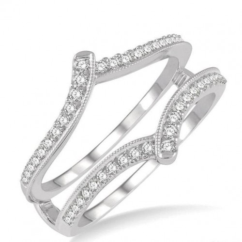 Impress her with a custom made engagement ring, by getting a semi mount ring and selecting a center stone for it. This engagement ring would be a good choice, as it comes preset with surrounding diamonds. The round center mount can hold a solitaire of carat ranging from 0.40 carat to 0.60 carat or any other round cut precious stone that you think she will love. The ring features 12 French pave set round cut diamonds lining the shank on either side of the center mount. It is styled in 14 karat white gold and is simply perfect for styling it your way. Total diamond weight is 1/2 ctw.