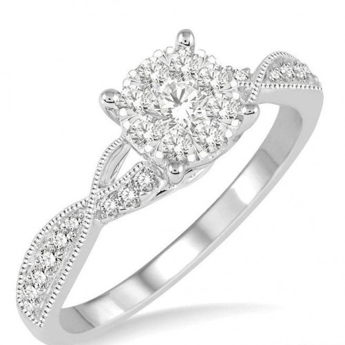 A charming diamond engagement ring, this makes for a quick choice. It is attractive and designed on clean lines, making it instantly catch the eye. The engagement ring features a cushion shape halo that makes up the centerpiece, with a pronged middle that is accented with a 1/4 ctw round cut diamond center stone. Embellishing the cushion halo is 16 prong set round cut diamonds. A plain gold straight shank completes the look. The diamond engagement ring is sculpted in a rhodium finish 14 karat white gold. Total diamond weight is 1/3 ctw.