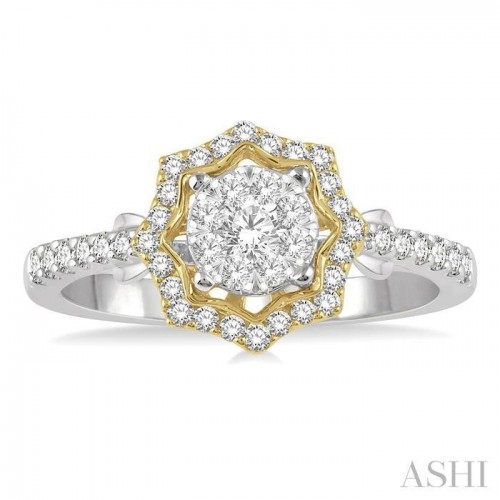 A distinctive design, two tone look and sparkle of well laid out round cut diamonds give this Lovebright lattice diamond ring a spectacular look. It features a round center mount that is surrounded by a carved star shaped exterior mount in 14 karat yellow gold. The round center mount is embellished with an invisible set round cut diamond in the middle and 8 more forming a halo around it. The star shaped outer mount is adorned by 24 wall set round cut diamonds. On the shank is visible 6 wall set round cut diamonds each, a total of 12 on either side. The gallery has a detailed design and is molded in 14 karat yellow gold. The center mount and the shank are styled in 14 karat white gold. Total diamond weight is 1/2 Ctw.