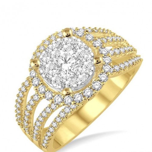 She will appreciate your sincere promise with this alluring diamond lovebright ring. Styled in 14 karat shining white gold this open work stylish designed ring showcases a set of 9 invisible set round cut diamond at the center further encompasses by dazzling 114 pave set round cut diamonds framing a circle and embellishing the broad split shank in criss-cross rows adding sparkle to the beauty of this opulent ring. Total diamond weight is 1 ctw.