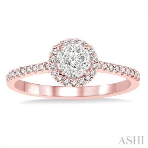 This diamond Lovebright ring makes an impression of extraordinary beauty. Styled in 14 karat shining rose and white gold this round shape ring showcases an array of 9 invisible set round cut diamonds at the center. Brilliant 36 prong set round cut diamonds, beautifully encompasses the center in round design and embellishes the shank with a row of dazzling diamonds. Total diamond weight is 1/3 Ctw.