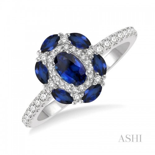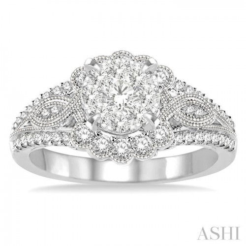 Regal and romantic, this diamond lovebright engagement ring will sparkle her eyes with your love. Fashioned in glistening 14 karat white gold this milgrain finish ring features a set of 9 invisible set round cut diamonds complemented by dazzling 46 prong and pave set round cut diamonds framing a halo and embellishes the ‘v’ designed split shank. Total diamond weight is 3/4 Ctw.