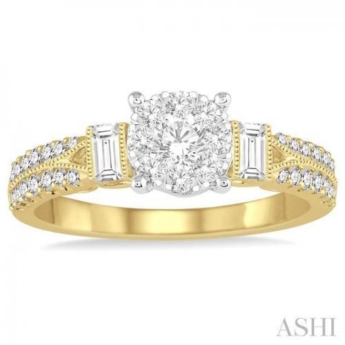 This is an exotic Diamond Lovebright Engagement Ring that is luxurious in its complex design. A clustered center gives way to two rows of sparkling diamonds on either side. The 39 baguette and round cut diamonds are studded in channel, invisible and prong settings to bring luminescence to the ring. This ring is made in 14 karat Yellow and White Gold with milgrain finish. Total diamond weight is 3/4 Ctw.