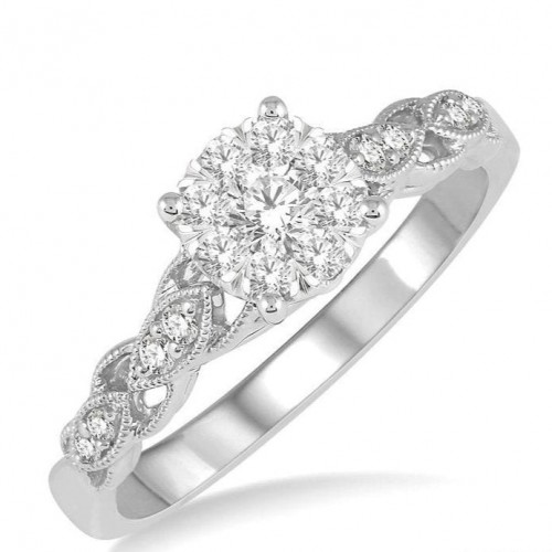 Sublime expression of your enduring love and dedication can be symbolized with this milgrain finish lovebright diamond engagement ring. Crafted in luminous 14 karat rose and white gold this ring is ablaze with glowing radiance of a set of 9 invisible set round cut diamonds and the floral designed shank is adorned with 22 round cut diamonds with bezel and pave setting. Total diamond weight is 3/8 ctw.