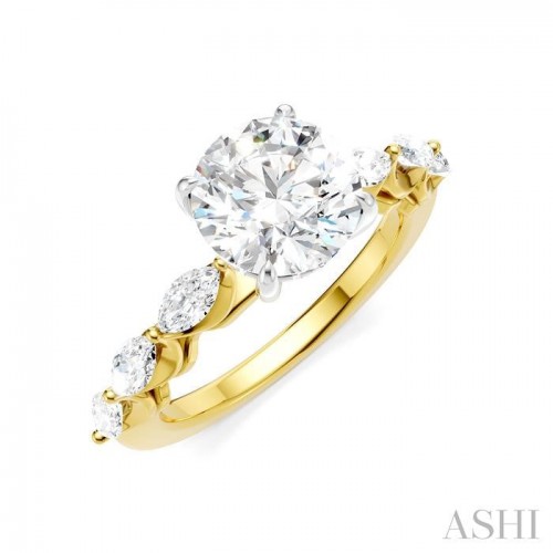 Begin a new chapter of your love with this exquisite semi-mount diamond engagement ring that offers a captivating blend of beauty and sophistication. It also gives you the freedom to choose a desired center stone, letting you the opportunity to create a ring that is as unique as your love, and ensuring that every glance at the hand serves as a reminder of the special bond you share. The ring features a 14 karat white gold prong-raised round-shaped center mount, where a round cut diamond ranging between 1.65 Ctw to 2.35 Ctw of your choice gets installed. Beautifying the shank are pre-decorated, 3 each fancy prong set marquise cut diamonds on either side, total 6 diamonds. 12 microscopic split prong set round cut diamonds embellish the gallery region. The semi-mount engagement ring is crafted in a rhodium finish 14 karat rose and white gold. The total diamond weight is 3/4 Ctw.