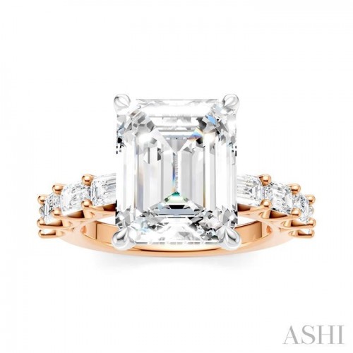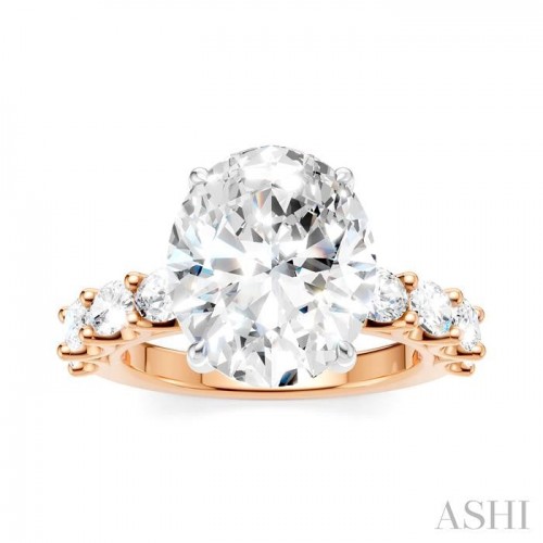 Celebrate your love story with this exquisite and meaningful semi-mount diamond engagement ring, destined to be treasured for a lifetime. Skillfully crafted with attention to detail, the ring features at its center, a 14 karat white gold prong-raised round-shaped mount designed to hold a center stone of your choice. This must be an round cut diamond in the range of 4.50 Ctw to 5.50 Ctw. Complementing the center mount are pre-adorned 4 each fancy prong set 1/6 Ctw oval cut diamonds on either side of the shank, adding a touch of glamour and refinement to the ring. Enhancing the gallery region are 10 microscopic split prong set round cut diamonds. The semi-mount engagement ring is fashioned in a rhodium finish 14 karat rose and white gold. The total diamond weight is 1 1/3 Ctw.
