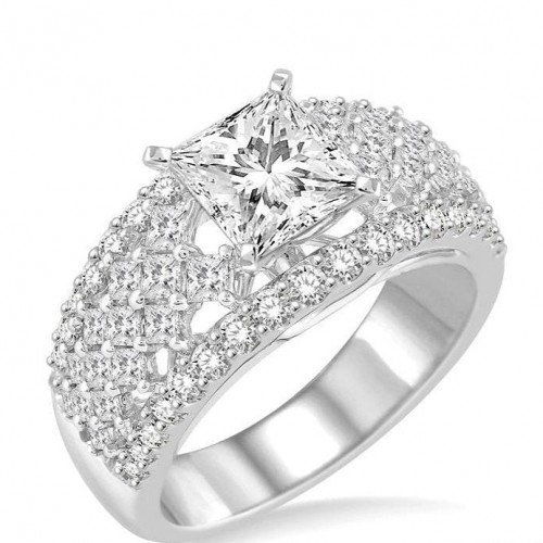 Express the immense love you feel for your sweetheart with this sparkling diamond semi-mount ring. Styled in 14 karat gleaming White gold the head of this ring is embellished by sparkling round cut diamonds in spiral design and the wide split shank is lined with dazzling rows of round cut accent diamonds adding beauty of this stylish ring. This ring is designed to frame your choice of center stone ranging from 0.85 carat to 1.20 carat. 114 brilliant round cut diamonds are set in prong settings. Total diamond weight is 1 3/8 ctw.