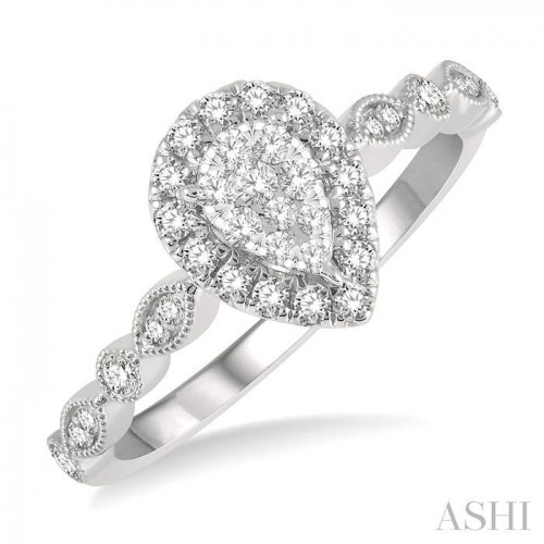 This diamond fashion band reframes classic splits with unexpected detail. From every angle, the interplay of ball-bead texture, linear baguettes, and prismatic round cuts unfolds like the pages of a miniature architectural tome. The band features a split top with three arms; a central strand of plain gold beads, tactile and rhythmic, bookended by two diamond and metal narratives. On one side, a round cut diamond reclines in a smooth bezel setting, its angular facet hugged by twisted rope accents that nod to handcrafted allure. A second bezel set round cut diamond veers slightly off-center, flanked by 18 prong set round cut diamonds, 7 on one side, and 11 on the other. The diamond fashion band is styled in 10 karat yellow gold. Total diamond weight is 1/5 Ctw.