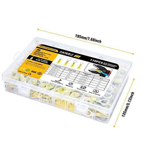 - Ring Terminals: 110Pcs yellow AWG12-10 heat shrink ring connectors with 4 stud sizes for your choose – #10 (25pcs), 1/4″ (30pcs), 5/16″ (30pcs), 3/8″ (25pcs) are suitable for a wide range of electrical projects from automotive to marine applications, providing a secure and stable connection.