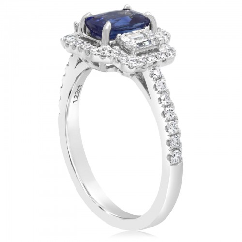 18K white gold sapphire & diamond ring from the Reis-Nichols Collection. The ring features one oval sapphire, two emerald cut diamonds, and 44 round brilliant cut diamonds. Size 6.5 in stock now. Special order sizes available. Pricing may vary with size.