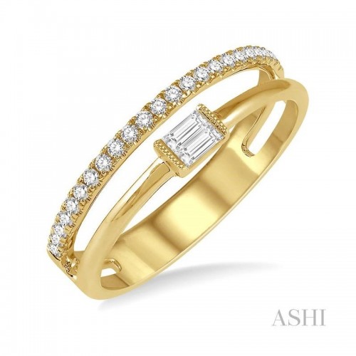 Scatter diamond jewelry is one of the new entrants of the season that has made its impression on the minds of buyers, resulting in a high demand for the style. This diamond scatter ring is from the collection, and like all other jewelry in the assemblage, it displays a random setting of diamonds. 20 sparkling prong set baguette cut diamonds have been placed haphazardly along the ring top. The scatter diamond ring is fashioned in a rhodium finish 14 karat white gold. The total diamond weight is 1/5 Ctw.