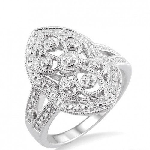 Enhance the glamour of your beloved’s style with this Vintage diamond ring. Fashioned in sterling silver, the ring features 11 pave set sparkling single cut diamonds. Total diamond weight is 1/20 ctw.