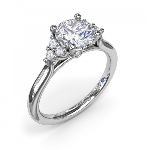 This sophisticated side cluster diamond engagement ring features a trio of round diamonds in a triangular motif showcasing the center diamond. This design can be customized based on stone shape and metal preference.