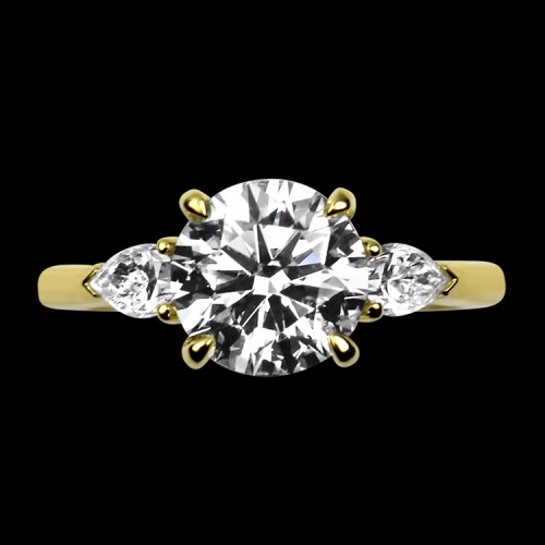 The GIA-certified center diamond exhibits a cut grade of EX/EX and has faint fluorescence. Marked “18k S”, this ring can be sized.