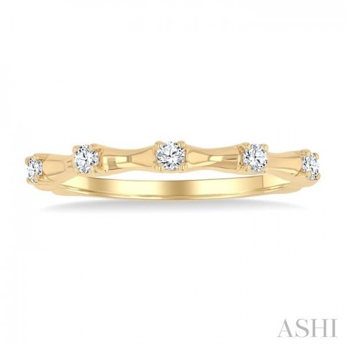 Combining nature-inspired elegance and symbolic significance, this diamond fashion ring makes for a meaningful accessory. Bamboo symbolizes resilience, strength, and flexibility in many cultures. It signifies growth, renewal, and the potential for prosperity, making the ring a thoughtful choice for someone who values these qualities. The top of the ring is designed to resemble a bamboo shoot, set in plain gold along with the shank. Creating a contrasting balance are the shimmering prong set round cut diamonds, total 5, embellishing each of the nodes on the bamboo shoot. The diamond fashion ring is carved in 10 karat yellow gold, complementing the sparkle of the diamonds and enhancing the overall aesthetic. The total diamond weight is 1/10 Ctw.