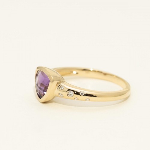 A distinctive trillion-cut amethyst commands attention with its deep purple hue and modern triangular profile. Set in warm 14kt yellow gold and accented by sparkling diamonds, this ring blends regal color with contemporary flair.