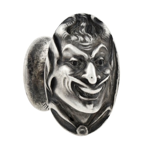 This exquisite pair of devil face figural cufflinks from the Art Nouveau era (ca1910) is a wonderful example of the Unger Brothers’ fine craftsmanship! Each oval-shaped piece is crafted in sterling silver and displays an exceptional repousse design across the front surface of one side. The raised, 3-dimensional design is complete with curved horns and sculpted facial features, and boasts a “devilish grin.” The raised areas of the design exhibit a smoothly polished surface which contrasts perfectly with the natural darkened patina, providing wonderful dimension to the fantastic motif. The image of the devil’s face is slightly askew, creating a very unique and eye-catching appearance when worn. Resting on the back of each cufflink is a curved silver bar, capped with an oval shaped plaque, which is stamped with a faded “925 FINE STERLING” surrounding the Unger Brothers’ signature hallmark. A fabulous Art Nouveau treasure by an esteemed maker, it would be right at home in any antique collection!