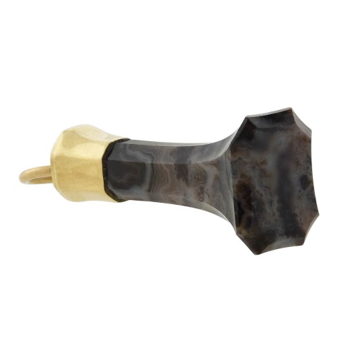 A beautiful carved agate fob from the Victorian (ca1880s) era! This gorgeous pendant features an elongated piece of carved agate stone, which has been hand carved into a smoothly polished octagonal shape at the base. The opaque stone displays an incredible combination of swirled colors including rich black, light and dark grays, milky white, and brown. A polished 10kt yellow gold cap adorns the top, which dangles from a simple round bail, perfect for hanging from a favorite chain. A unique Victorian era fob, it would make a lovely addition to any collection!