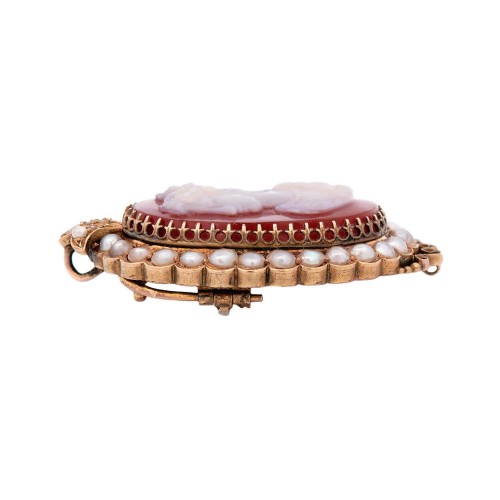 Condition: The overall condition of the pin/pendant is excellent. Besides normal surface wear, there is no apparent damage to the cameo or to the gold frame and all of the pearls are intact and securely set. The bail and clasp are secure and in good working condition.