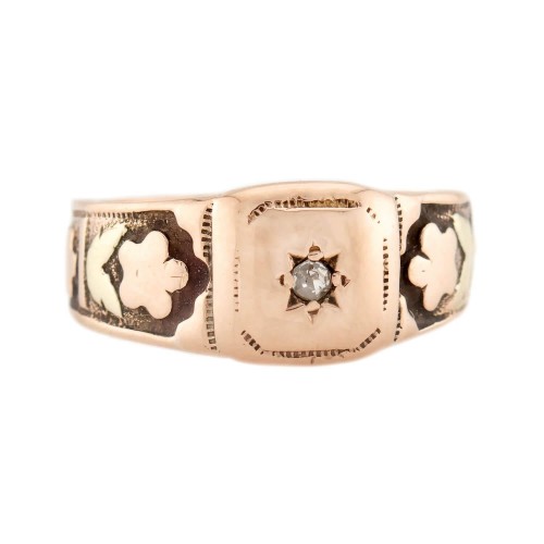 A lovely diamond ring from the Victorian (ca1880s) era! Crafted in 14k yellow, rose, and greenn gold, the center of this ring features a small, bead-set diamond. The diamond is surrounded by an engraved starburst-motif frame, and further encircled by a square-shaped plaque. The surface of the plaque is smooth and simple, and features dainty texturizing-engravings. The shoulders of the ring feature floral and foliage-motif engravings, which add to the dainty look of the ring. The remainder of the band is smooth and simple, and the inside of the shank features a “14” purity mark. A wonderful example of Victorian-era craftsmanship, this piece would make a great addition to any antique jewelry collection!
