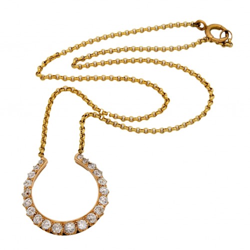 Condition: The overall condition of the horseshoe pendant necklace is excellent. Besides normal surface wear, there is no apparent damage to the yellow gold setting. All of the diamonds are secure and intact. The chain and spring Ring clasp are both secure and in working order.