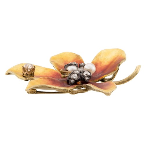 Victorian 14k Diamond, Pearl, and Enamel Flower Pin