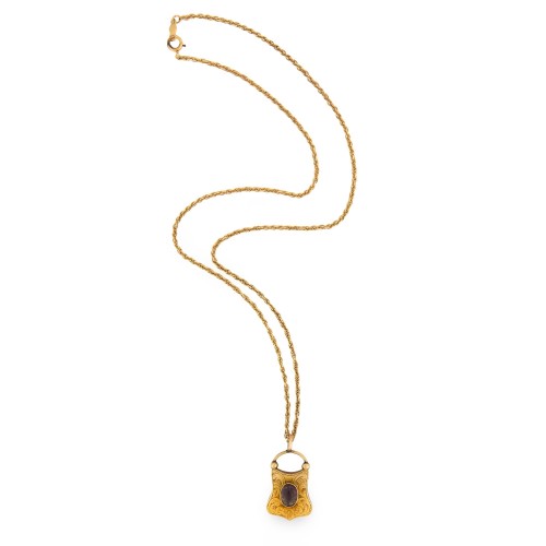 An absolutely charming padlock pendant necklace from the Victorian (ca1880s) era! This delightful piece is crafted in 14k yellow gold, and begins with a gold, braided chain. The chain secures with a spring ring clasp, which is stamped: “14K”. The center of the piece features a padlock-motif pendant, which is decorated with a bezel-set quartz cabochon. the front surface of the padlock pendant is further adorned with swirling-motif engravings, and the backside features an oval-shaped frame, which would allow the wearer to insert a small photograph or memento. The top of the pendant features a bail, which allows the piece to easily slide along the chain. A lovely example of Victorian-era style, this pendant necklace would make a fantastic addition to any Victorian-era jewelry collection!