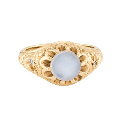 A gorgeous moonstone ring inspired by the Victorian (ca1880s) era! Crafted in 14k gold, the handmade setting has a decorative repousse design, comprised of flowing swirls and scrolls. Resting at the center is an alluring moonstone cabochon, which is held within a 10-prong setting. The translucent moonstone is very clear, exhibiting a a strong iridescent quality that flashes in the light. Set on the shoulders of the ring are two delicate single cut diamonds, which weighing approximately .02ct each. The accent diamonds are bezel set amidst the carved detail, adding a soft sparkle! At the back of the setting is a smooth, tapered band, which is stamped “14K” inside the shank beside a maker’s mark. Both artistic and sculptural, the ring looks positively magnificent when worn!