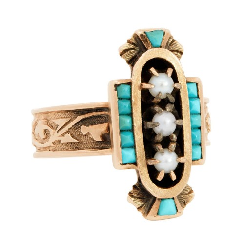 A fabulous turquoise and pearl navette ring from the Victorian (ca1880s) era! Crafted in 14k yellow gold, the piece features a navette centerpiece that is decorated with turquoise and pearl stones. Three pearls run vertically down the front of the centerpiece, and are held within six-prong settings. The pearls are held within an ellipse-shaped gold frame, which is decorated on both sides with five turquoise cabochons held within channel settings. The top and bottom of the centerpiece also feature a fan-shaped motif, with each end featuring another turquoise cabochon. The band of the ring is decorated with intricate scrolling motif etchings, which further add to the unique appeal of the ring. The inside of the shank features an engraved personalization which reads: “A.M. JUNE 1886“. A truly magnificent Victorian piece, this ring would make a wonderful addition to any collection!
