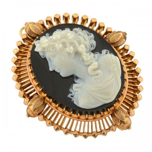 A large hand carved cameo pin/pendant from the Victorian (ca1880) era! Set in vibrant 14kt rose gold, the beautiful face of a young woman graces the center of this piece. Highly detailed, the woman is wearing what appears to be leaves and flowers in her hair with small tendrils peeking down. A dress is draped across her bust and shoulders and a soft expression can be seen in her face. The stone cameo is prong set within a fantastic beaming gold wirework frame which surrounds the outside of the entire cameo and on the back is a c-catch clasp and a flip down bail. This stunning cameo is simply wonderful and would make a lovely addition to any collection!